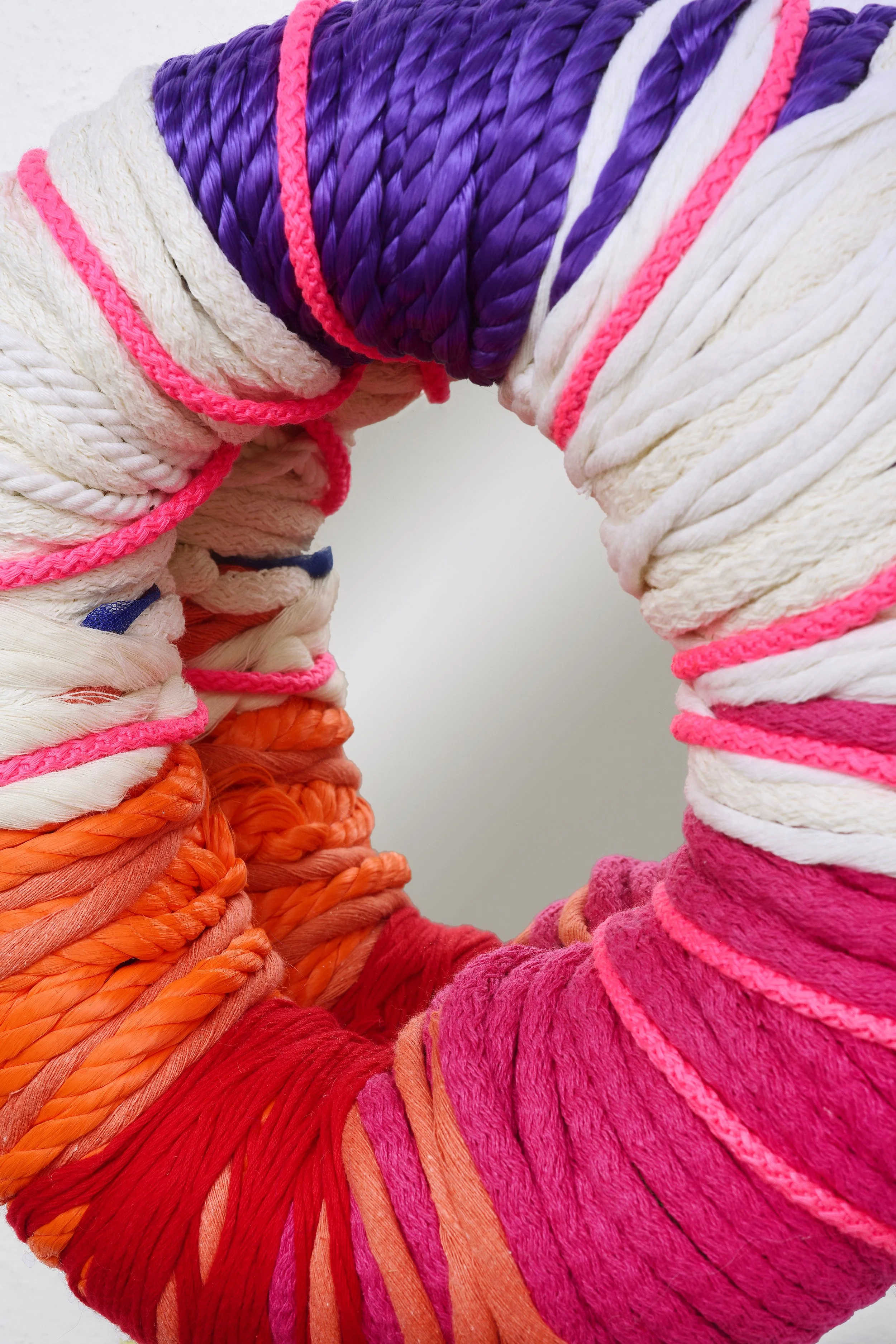 The ring mirror edition, is inspired by the cosmos and by magic, the piece is an sculptural shape from a cotton foam ring with a range of layers of different textures, such as tulle, organic cotton cord and recycled polyester, to create dimension and a dialogue.